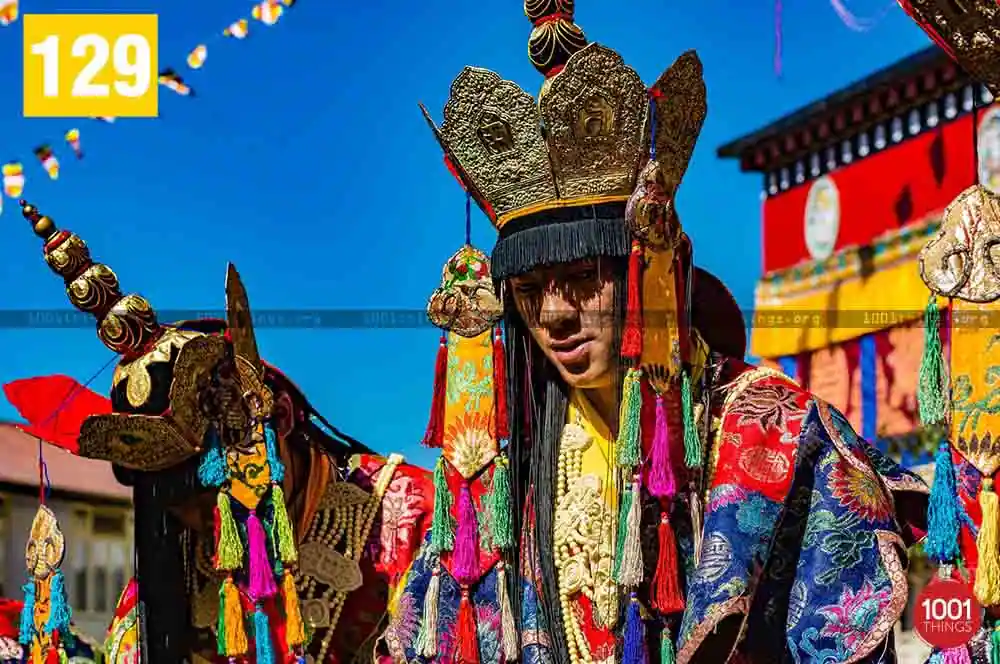 The Monks performing Cham are robed in highly ornamented costumes of brightly coloured silk and wear elaborate masks, the mask that monks wear represents various deities and demons, as well as animals. Sometimes they dance holding ritual instruments. Other monks accompany them, in instrumental music ensembles, playing traditional Tibetan instruments. There is a leader present who keeps time with cymbals, while others play wind instruments or drums.