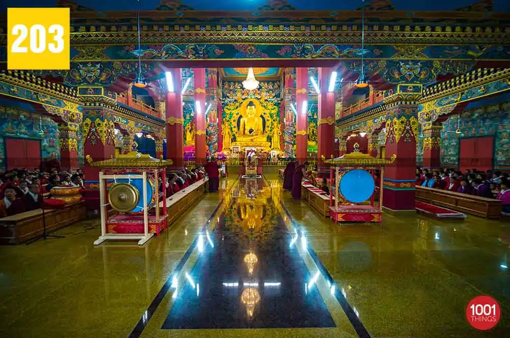 Every inch of the interiors and exteriors retains a vibe of immense spirituality. The grand statues of Buddha in the meditating pose is installed inside the temple block. The monastery is painted in brownish-red and the pillars depict the radiant hues of bright red and gold. The front-facing side is most appealing as it dazzles in golden shade. There is a massive circular yard infront of the main building. A wide flight of stairs at the front/entrance leads you to the first floor where an array of prayer wheels are arranged throughout the circular pathway. The circular shape adds to the peculiarity and appeal of the monastery. The visitors can enjoy stunning views of the surrounding nature from the monastery.