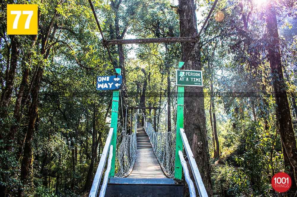 Hanging Bridge or canopy walkway is located in Lolegaon, a tiny hill side tourist destination near Kalimpong. It is basically a foot over bridge over the vast canopy of trees on either sides.