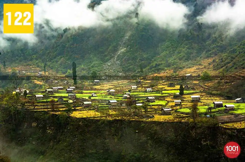 Lachung is home to the 19th-century Buddhist Lachung Monastery enclosed by apple orchards. Yumthang Valley’s Shingba Rhododendron Sanctuary thrives closely. Additionally, Lachung is the base camp for the Rhododendron Valley Trek. The most scenic trek begins from Yumthang Valley and ends at Lachen Valley. The place also offers breathtaking sights of untouched pine forests, crystal streams, and waterfalls, hot springs, and the valley of wildflowers.