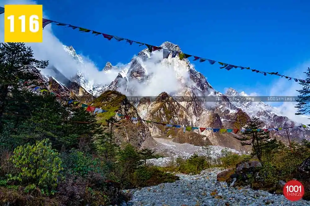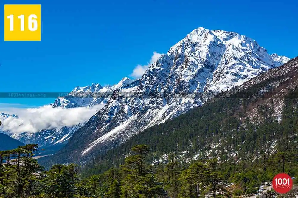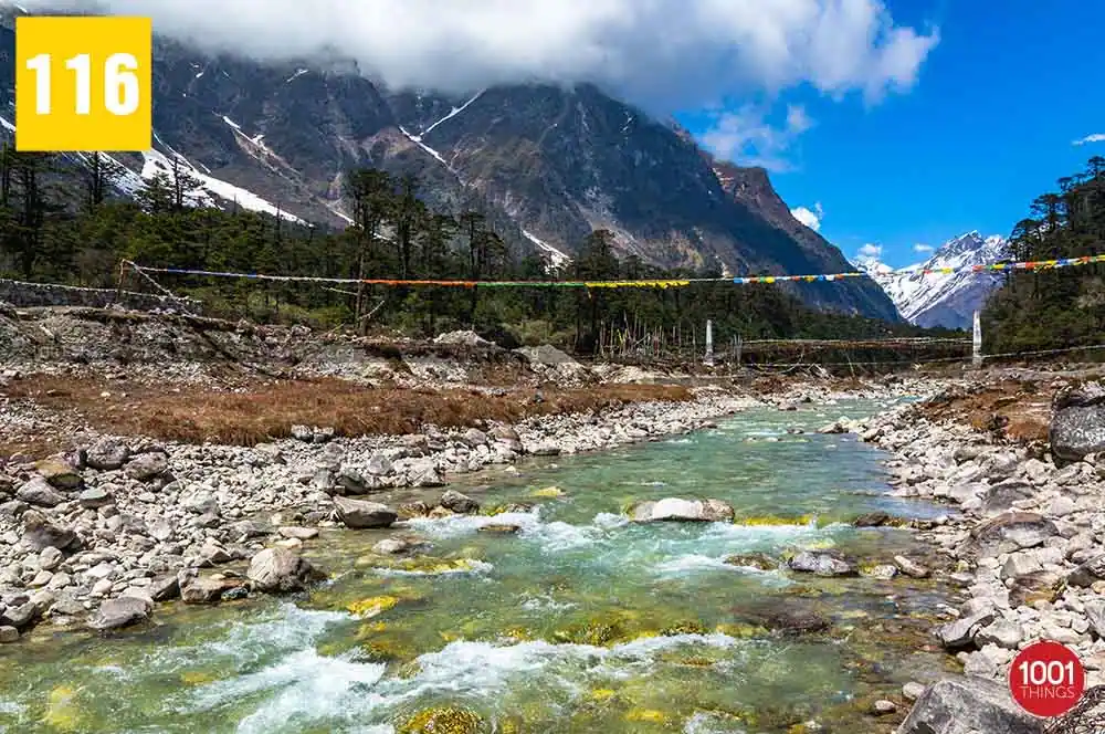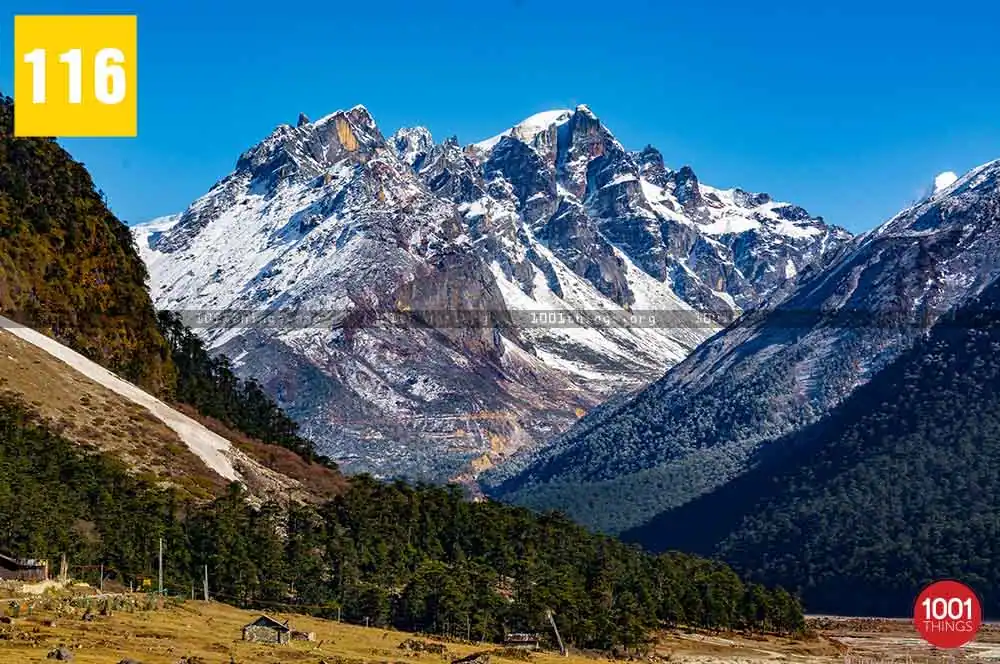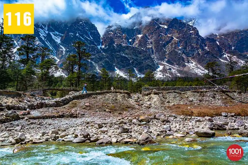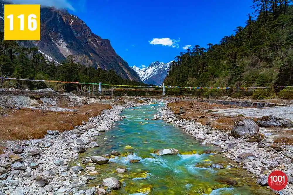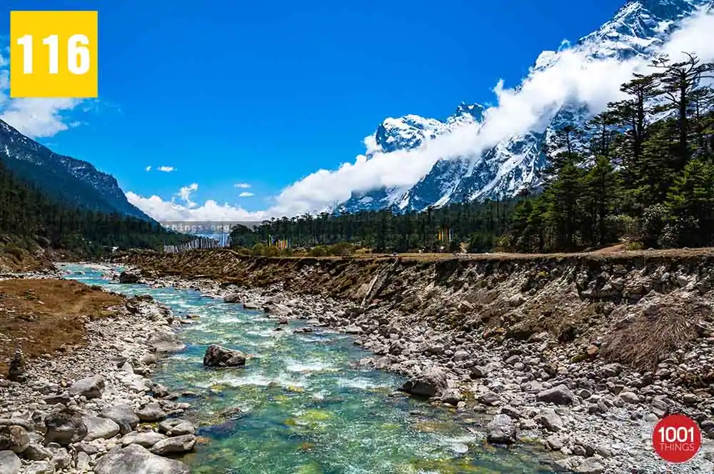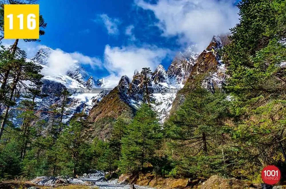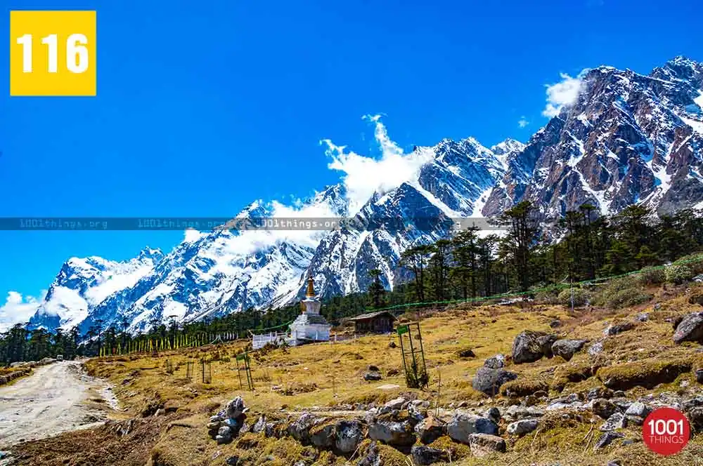 Zero Point, also known as Yumesamdong is located further up at an approximate distance of 23 km from Yumthang. Located an elevation of 16,000 feet, civilians are not allowed to go beyond or drive further from Zero Point. It’s because the Indo-China border lies just a short distance away from Zero Point. Zero Point or Yumesamdong is the confluence of three rivers. Surrounded by the snow-clad peaks, the place offers a remarkable sight to behold.